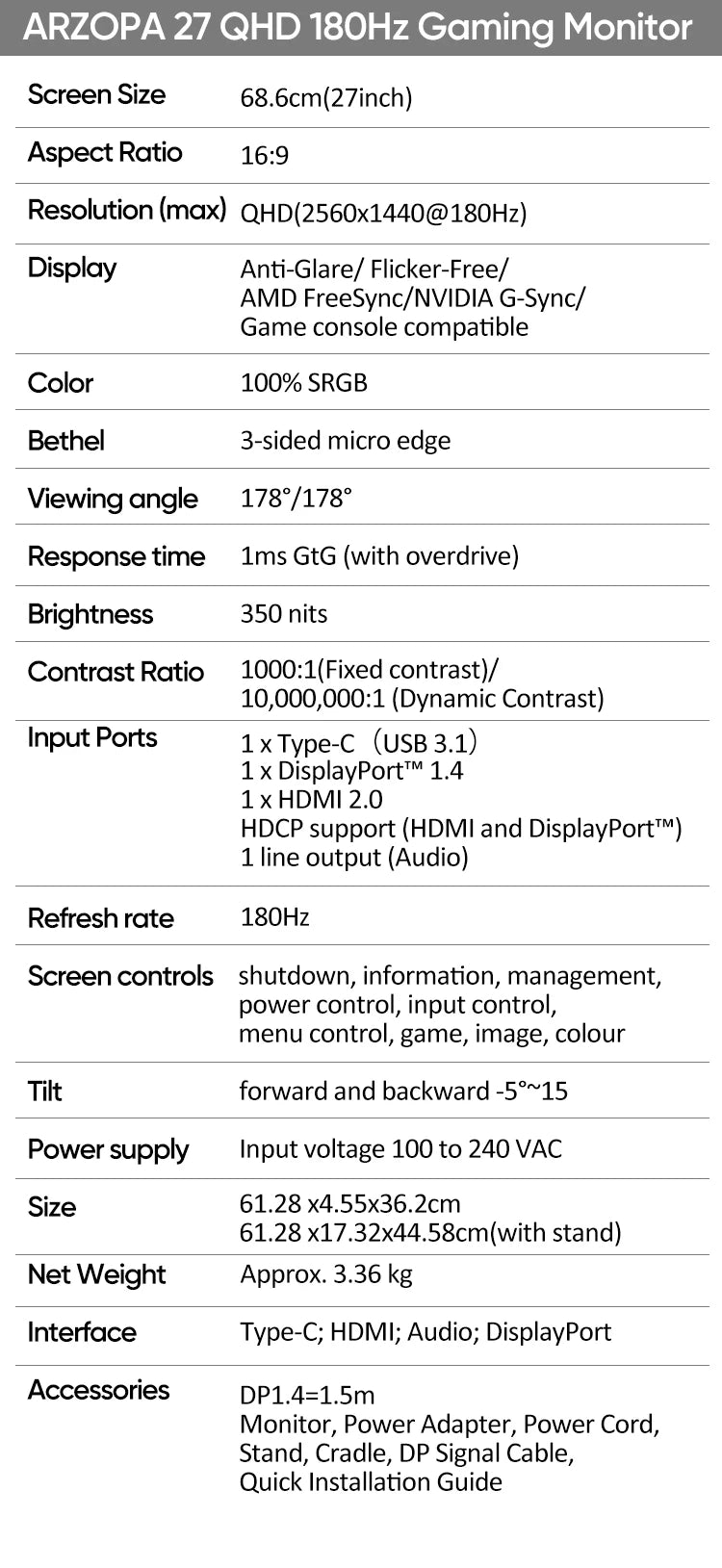 The ARZOPA 27" 180Hz 2K QHD Gaming Monitor is perfect for gamers and professionals seeking speed, clarity, and comfort. With Fast IPS technology, 1ms response, Adaptive Sync, and eye-care features, it delivers smooth gameplay, vibrant colours, and long-term comfort. Ideal for competitive gaming, creative work, and multimedia entertainment, it offers flexibility, professional-grade visuals, and a sleek design for any setup.
