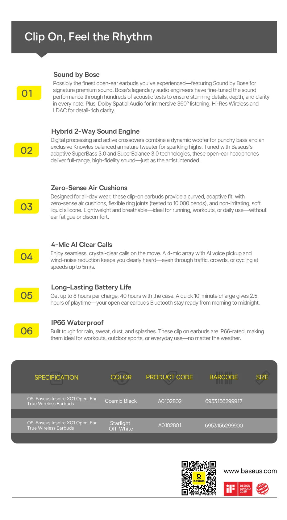 The BASEUS Inspire XC1 Bluetooth Wireless Open-Ear Headphones are designed for active lifestyles, sports enthusiasts, and audiophiles. Combining Bose-tuned Hi-Res sound, open-ear comfort, IP66 durability, and smart app control, these earbuds are perfect for music, calls, and outdoor activities. Stay aware of your surroundings while enjoying premium wireless audio anywhere, anytime.