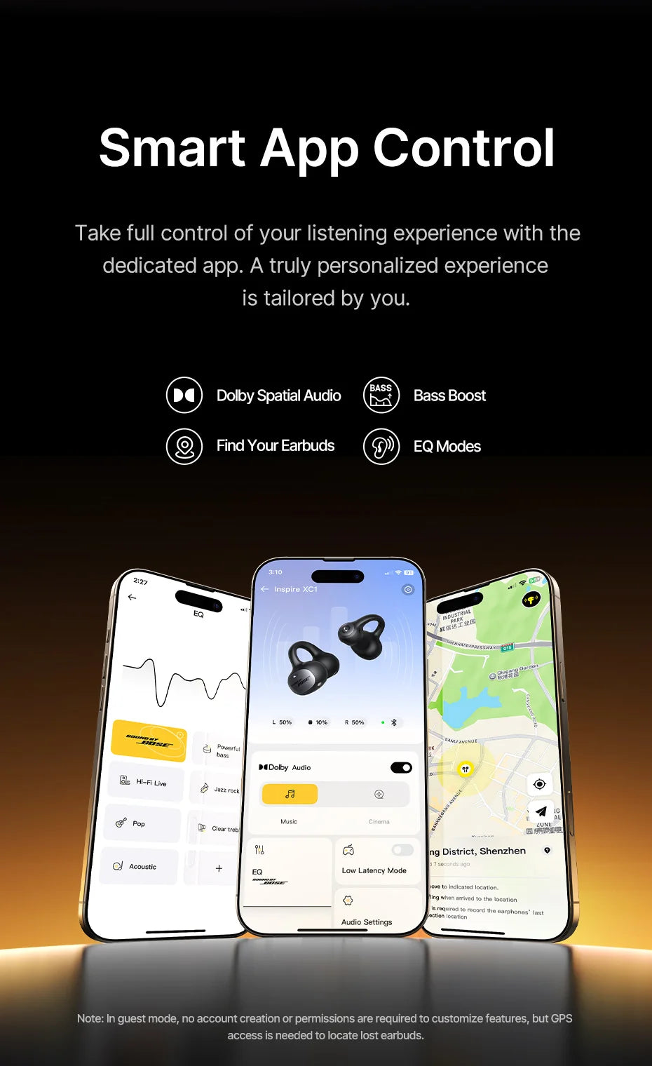 Experience exceptional sound quality tuned by Bose. The Inspire XC1’s hybrid 2-way sound engine balances armature drivers for crisp highs and dynamic drivers for deep, powerful bass. Combined with Dolby Spatial Audio, enjoy 360° immersive sound that brings music, podcasts, and calls to life with astonishing clarity.