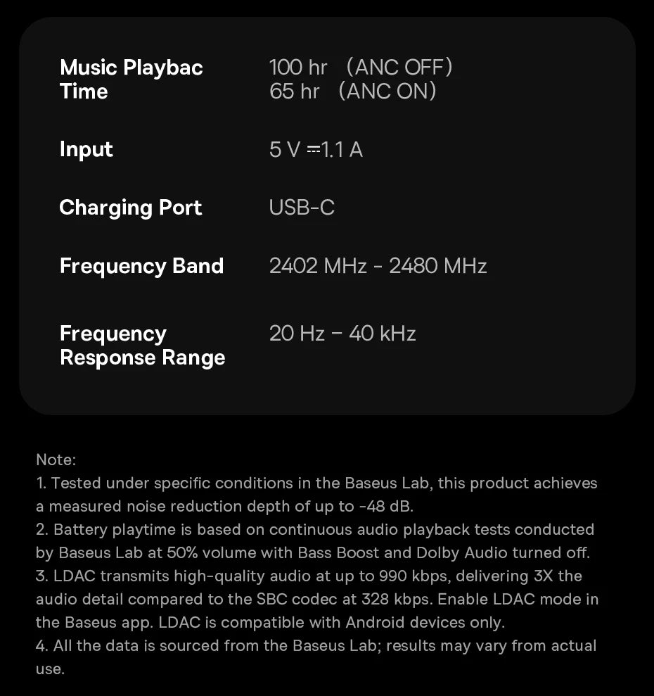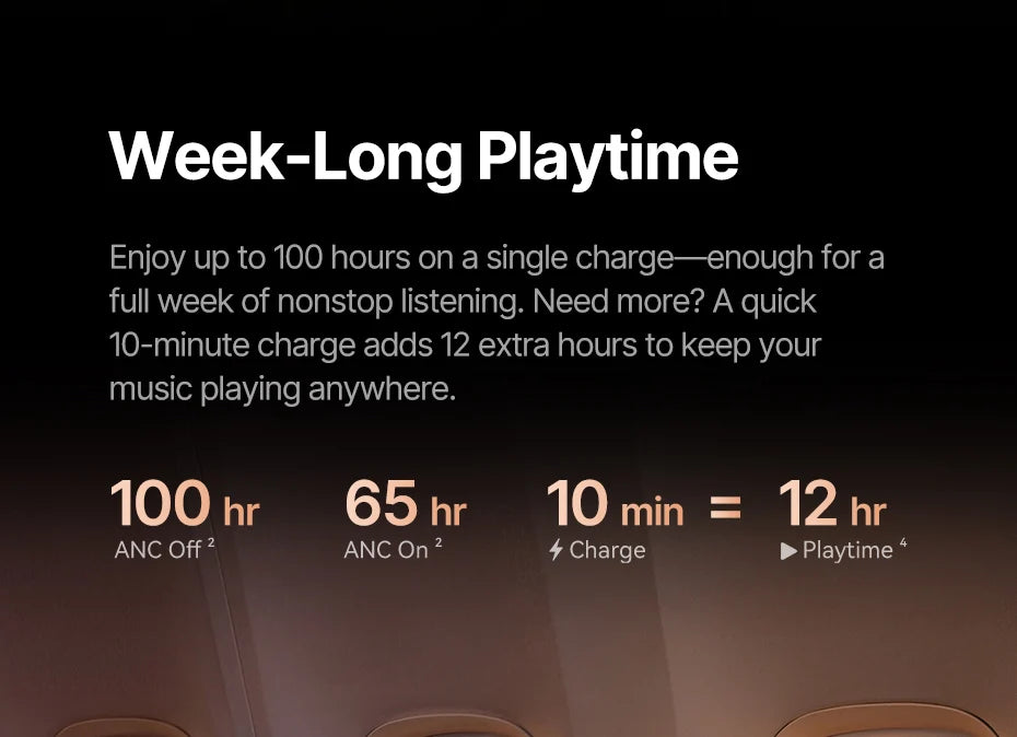 - Battery Life: 100 hours (ANC off), 65 hours (ANC on)
