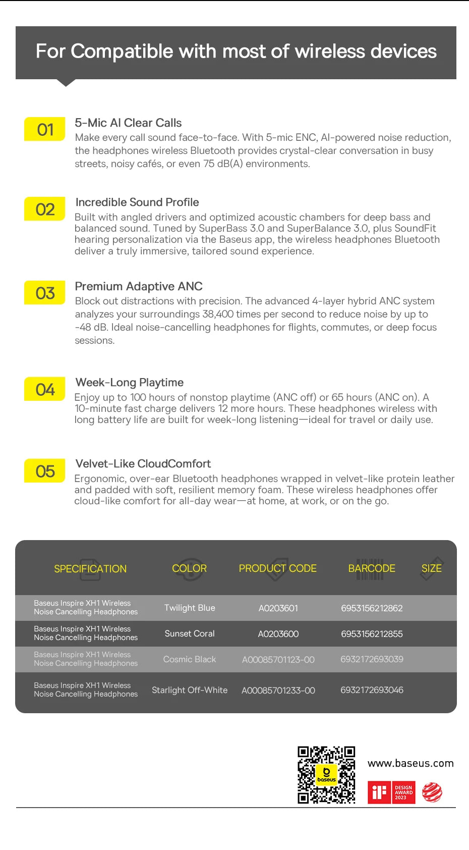 The BASEUS Inspire XH1 Active Noise Cancelling Headphones are perfect for audiophiles, gamers, and commuters. With Sound by Bose, Dolby Spatial Audio, Hi-Res LDAC, adaptive ANC, 100-hour battery life, and premium comfort, the XH1 provides immersive sound, clear calls, and long-lasting reliability.