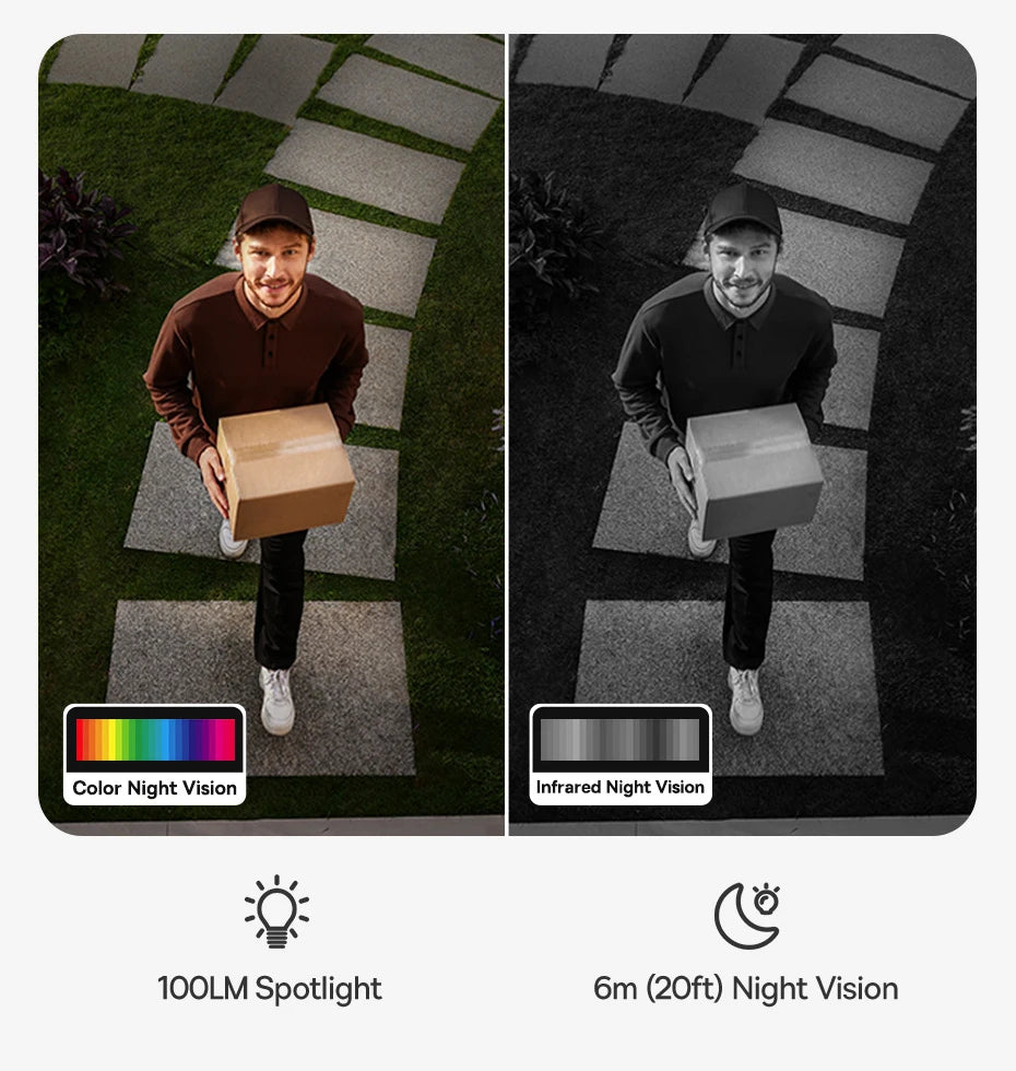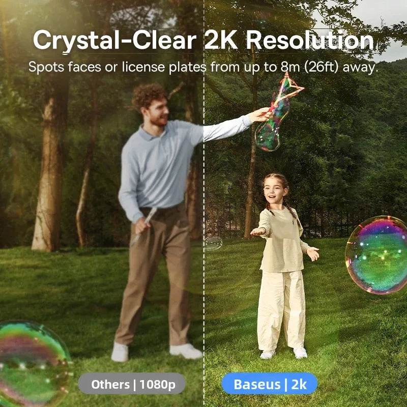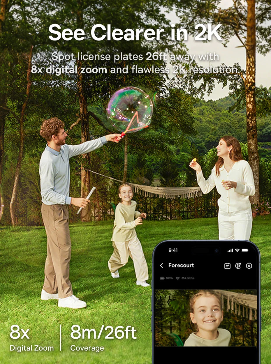 Capture every detail with 2K resolution and 8x digital zoom, enabling you to spot faces, license plates, or suspicious activity from up to 26ft away. Your footage will remain sharp, vivid, and full of detail, even at night.
