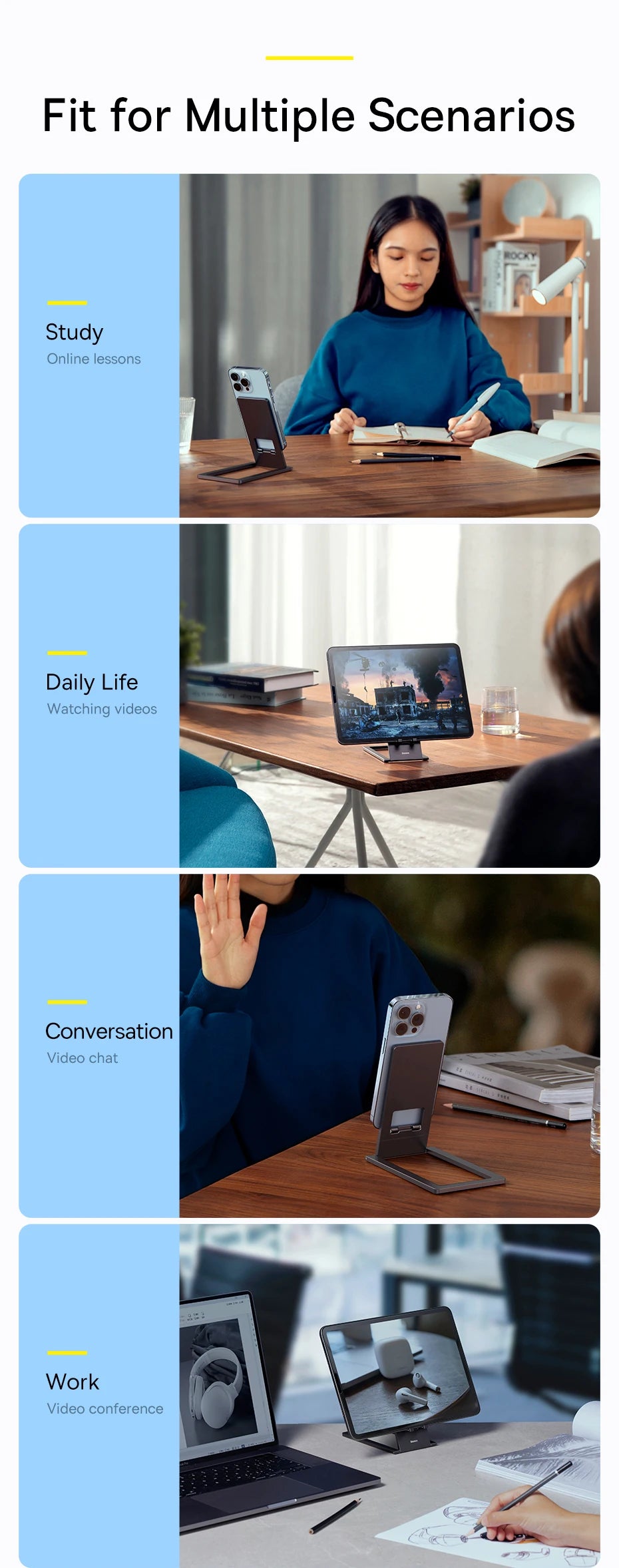 The BASEUS Universal Adjustable Tablet & Phone Stand is designed to accommodate both tablets and phones, offering flexible positioning for enhanced viewing comfort. With adjustable height and angle settings, you can customize the stand to your preferred position, making it ideal for watching videos, video calls, or working.