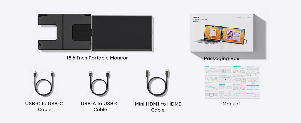 - Included in Box:1 x Portable Monitor1 x USB-C to USB-C Cable1 x USB-A to USB-C Cable1 x Mini HDMI to HDMI Cable1 x User Manual