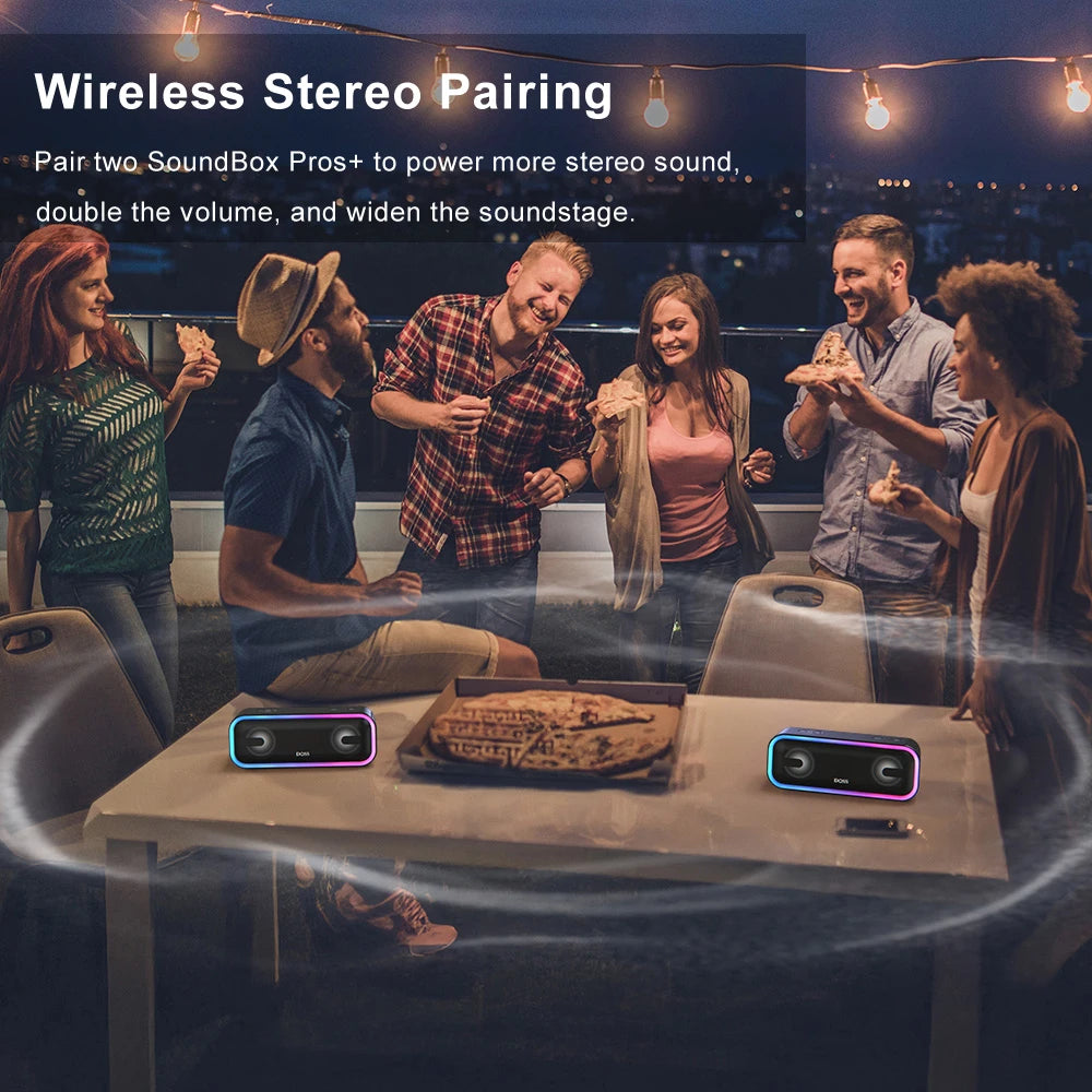For those who want a rugged, stylish speaker that delivers both quality sound and vibrant party lighting, the DOSS SoundBox Pro+ is the perfect choice. Its waterproof design makes it ideal for outdoor fun, while the booming bass and clear stereo sound fill any space with energetic tunes. The intuitive extra bass button and TWS pairing add extra versatility, letting you customize your sound and amplify your party. Compact, portable, and packed with features, this speaker is ready to be your everyday music companion—wherever life takes you.