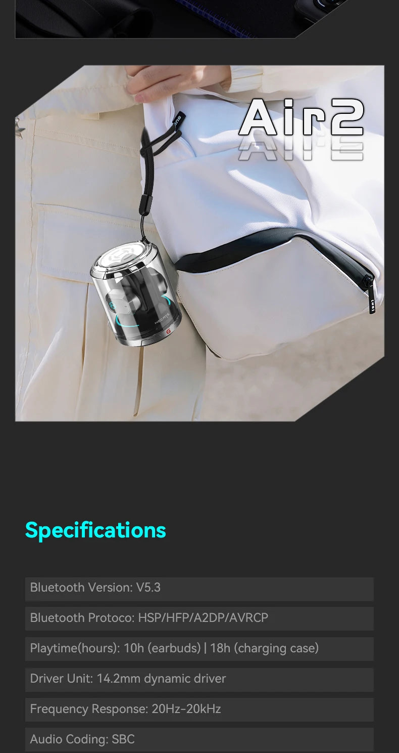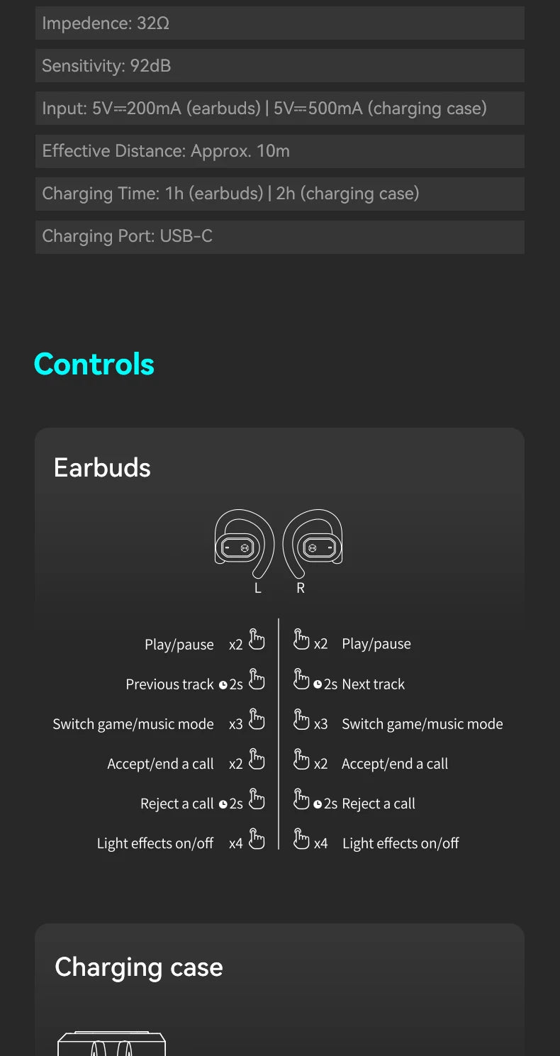 - Battery Capacity: Earbuds: 5V/200mA, Charging Case: 5V/500mA