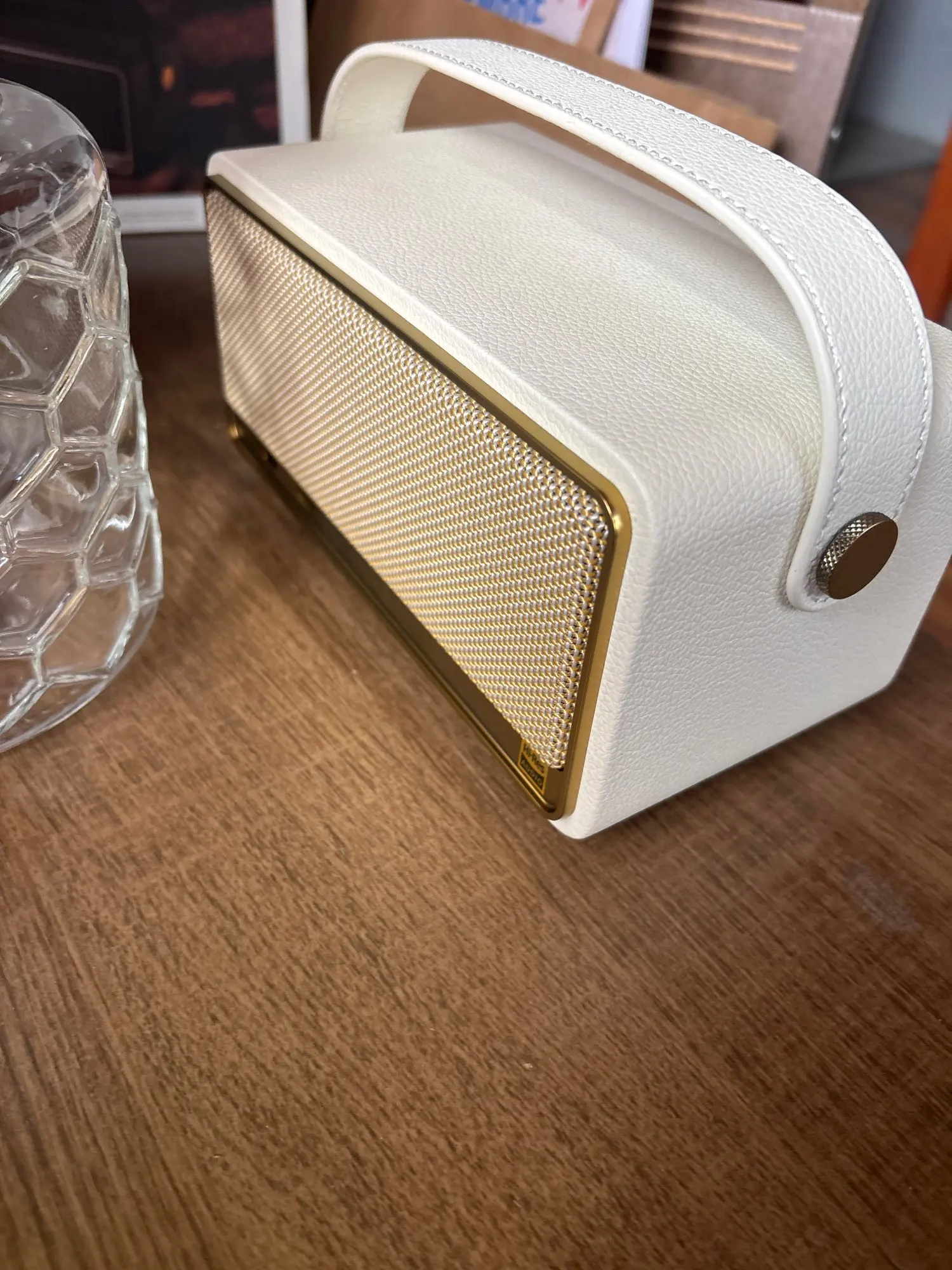 - Portable and Durable Design – Compact with a sturdy handle, leather cabinet material, and metal tweeters for durability.