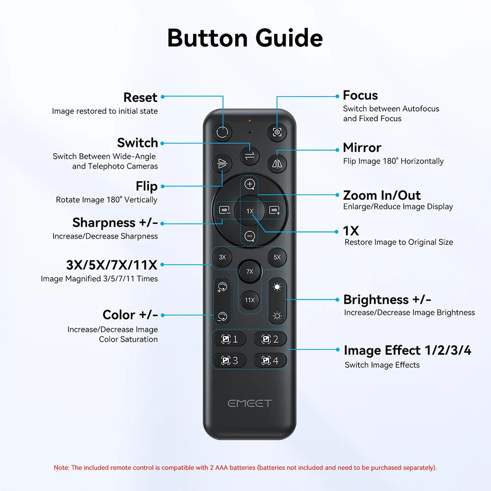 The included remote lets you switch cameras, adjust images, and control settings effortlessly. Compatible with 2 AAA batteries (not included).
