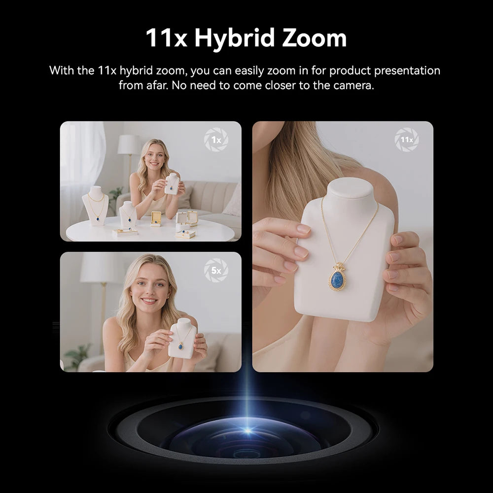 Easily zoom in on products, documents, or objects from a distance with 11x hybrid zoom. The camera can also be rotated on a tripod via the 1/4" mount, enabling flexible portrait-mode content creation for mobile-ready videos.