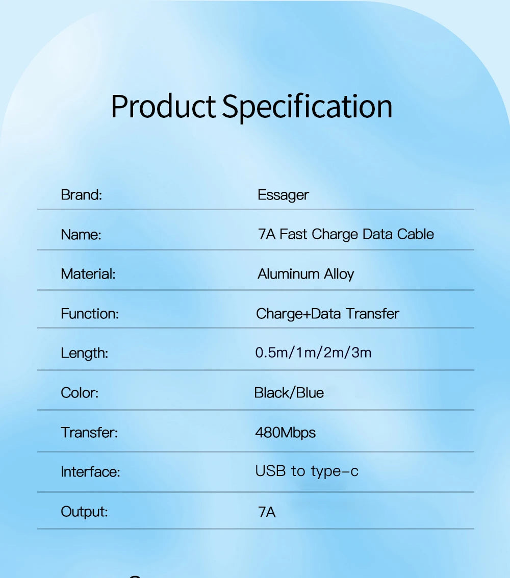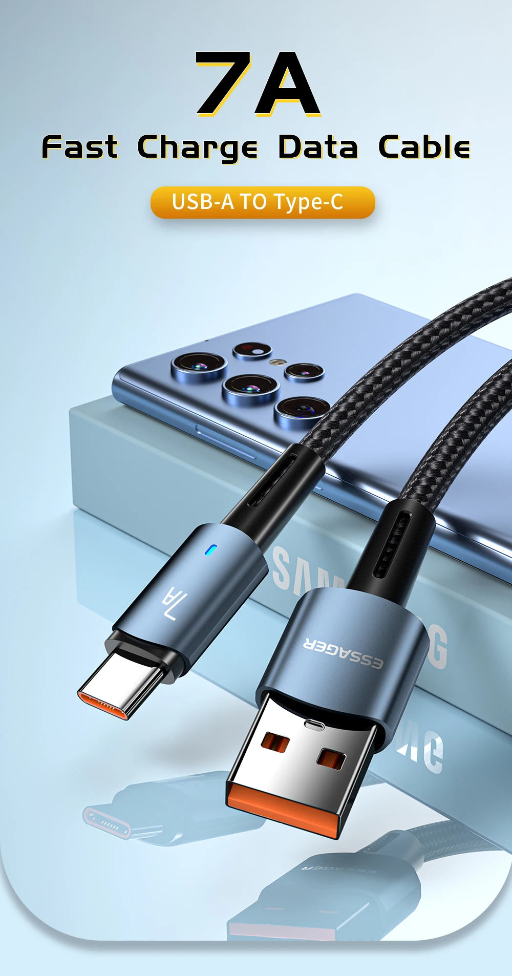 The ESSAGER 7A USB to Type-C Charging and Data Cable is designed for fast, reliable charging and efficient data transfer. With a maximum output of 7A, this cable ensures your devices are charged quickly, minimizing downtime and enhancing productivity.