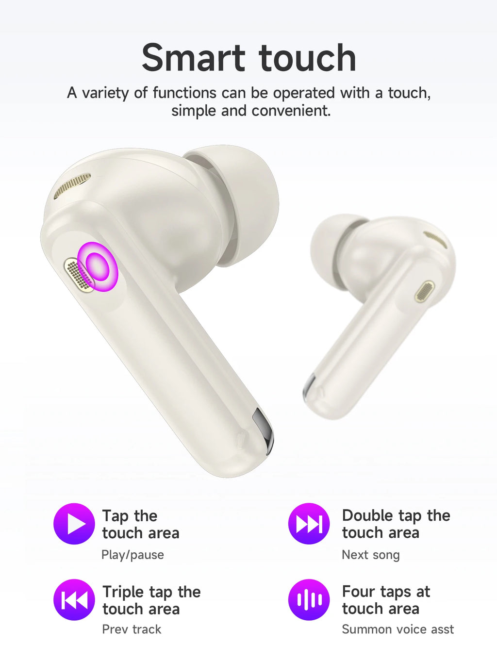 The earbuds support touch controls and sliding tuning, enabling easy adjustment of playback, calls, and noise-cancelling modes. Master-slave switching allows either earbud to be used independently for added convenience.