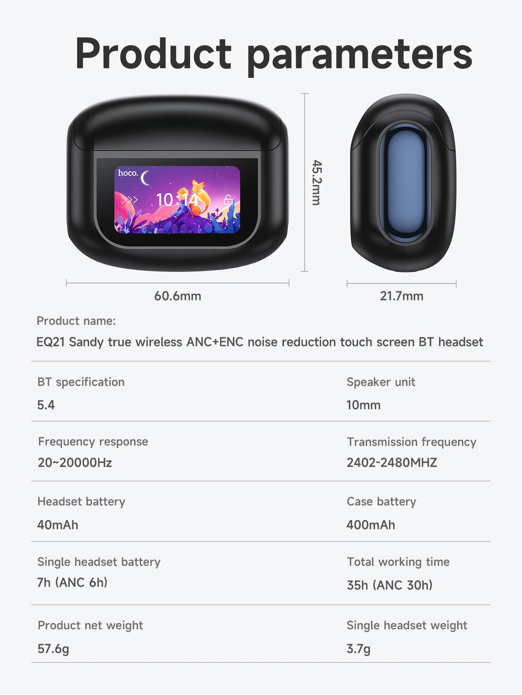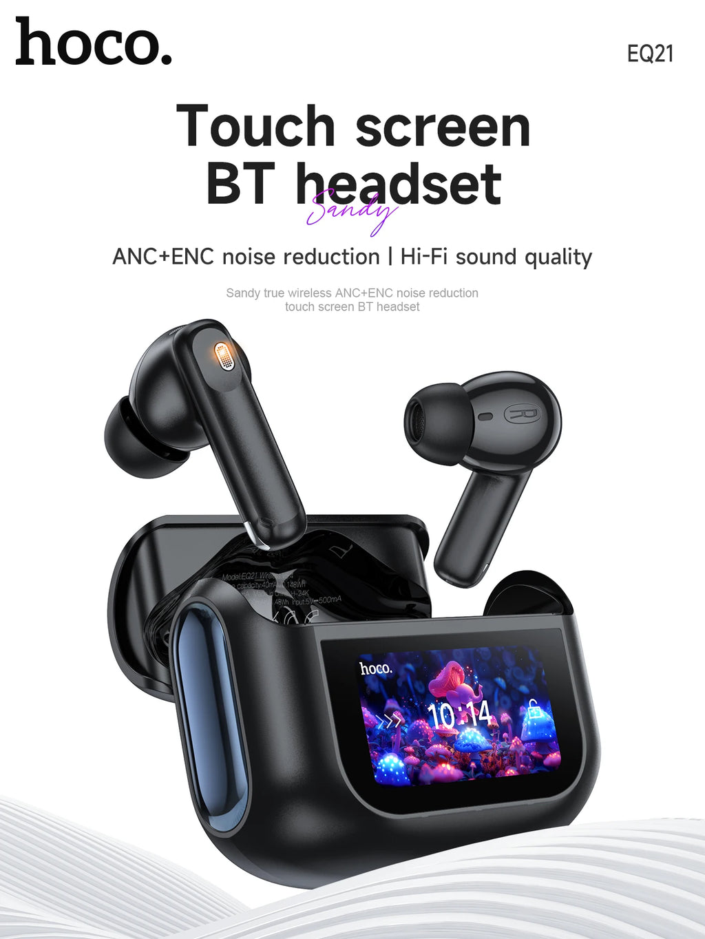 The HOCO EQ21 Noise Cancelling Wireless Earbuds stand out with their smart touch screen charging case, dual ANC + ENC noise reduction, and Bluetooth 5.4 performance. Perfect for users who want greater control, clearer calls, immersive sound, and modern convenience, the EQ21 is an excellent choice for daily listening, commuting, and travel—all packed into a compact, feature-rich true wireless design.