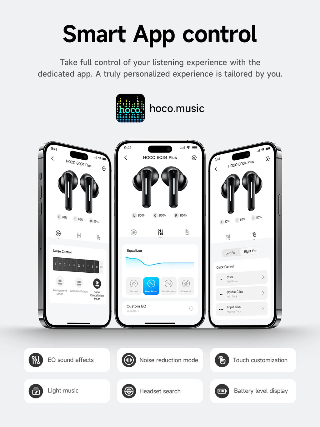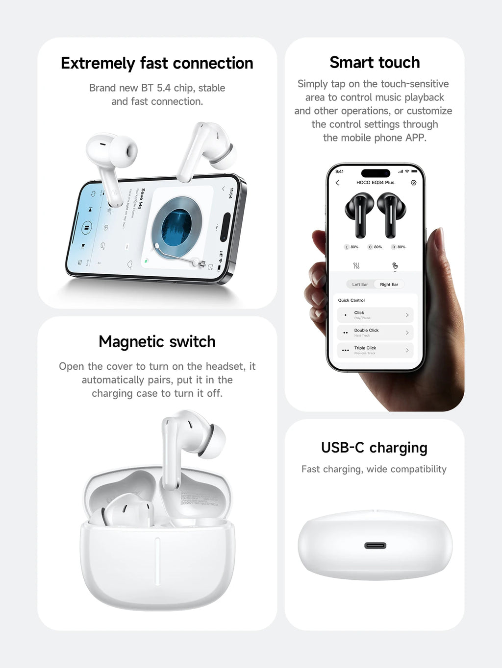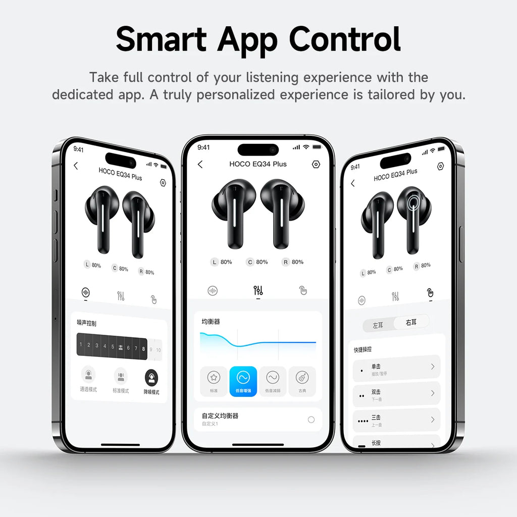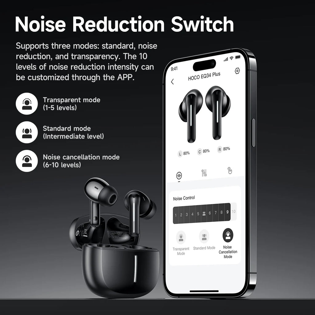 The HOCO EQ34 Plus True Wireless Earbuds are designed for users who demand high-quality audio, effective noise cancellation, and convenience on the go. With customizable app controls, ergonomic fit, and extended battery life, these earbuds are perfect for music lovers, athletes, commuters, and professionals seeking clear sound and uninterrupted performance wherever they are.