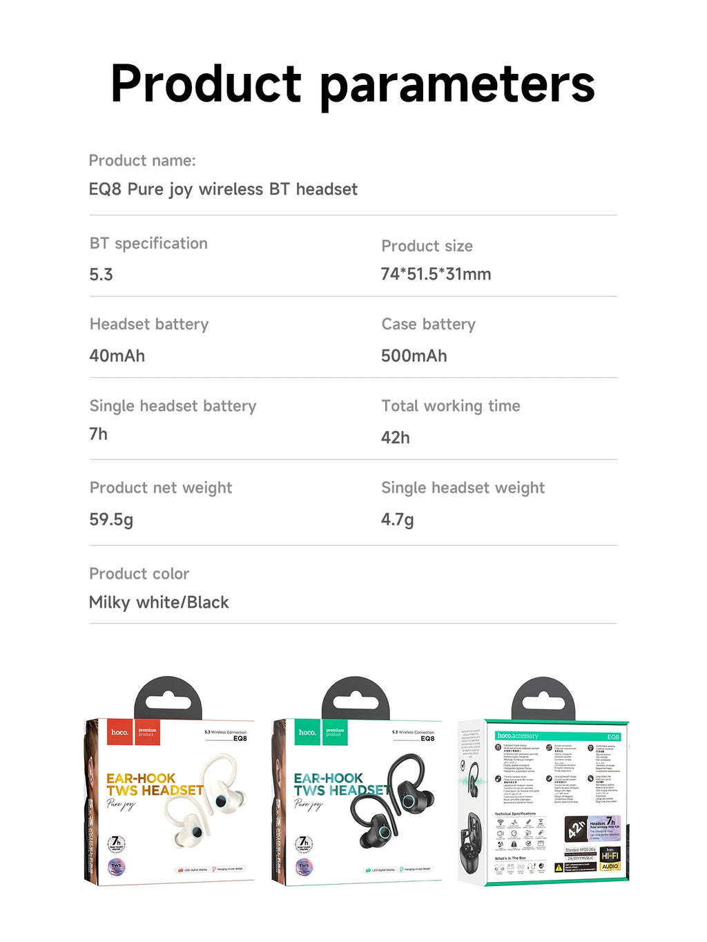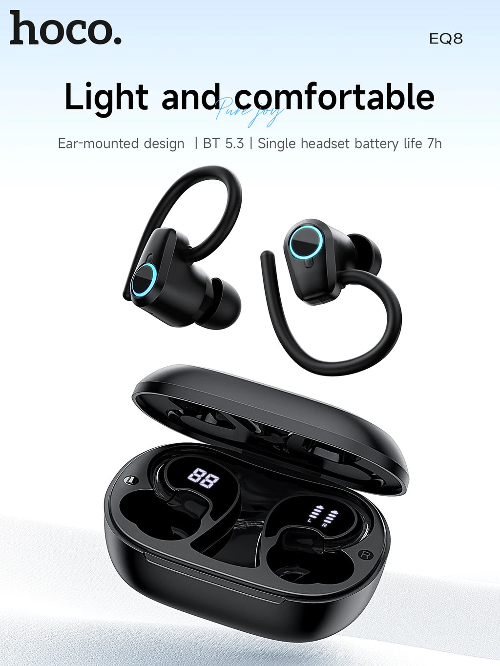 The HOCO EQ8 Wireless Earbuds deliver premium Sport HiFi Music, stable Bluetooth 5.0 connectivity, and ergonomic over-ear hooks for secure, all-day wear. Featuring an LED digital display on the charging case, touch controls, and IPX5 water resistance, these earbuds are perfect for workouts, outdoor activities, or daily listening. With up to 8 hours of playtime, the EQ8 ensures uninterrupted music, calls, and entertainment wherever you go.