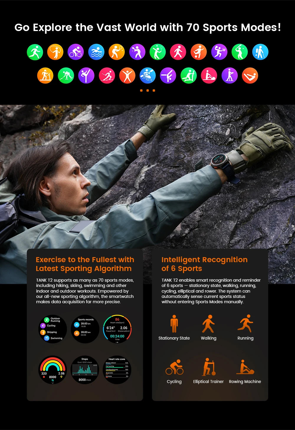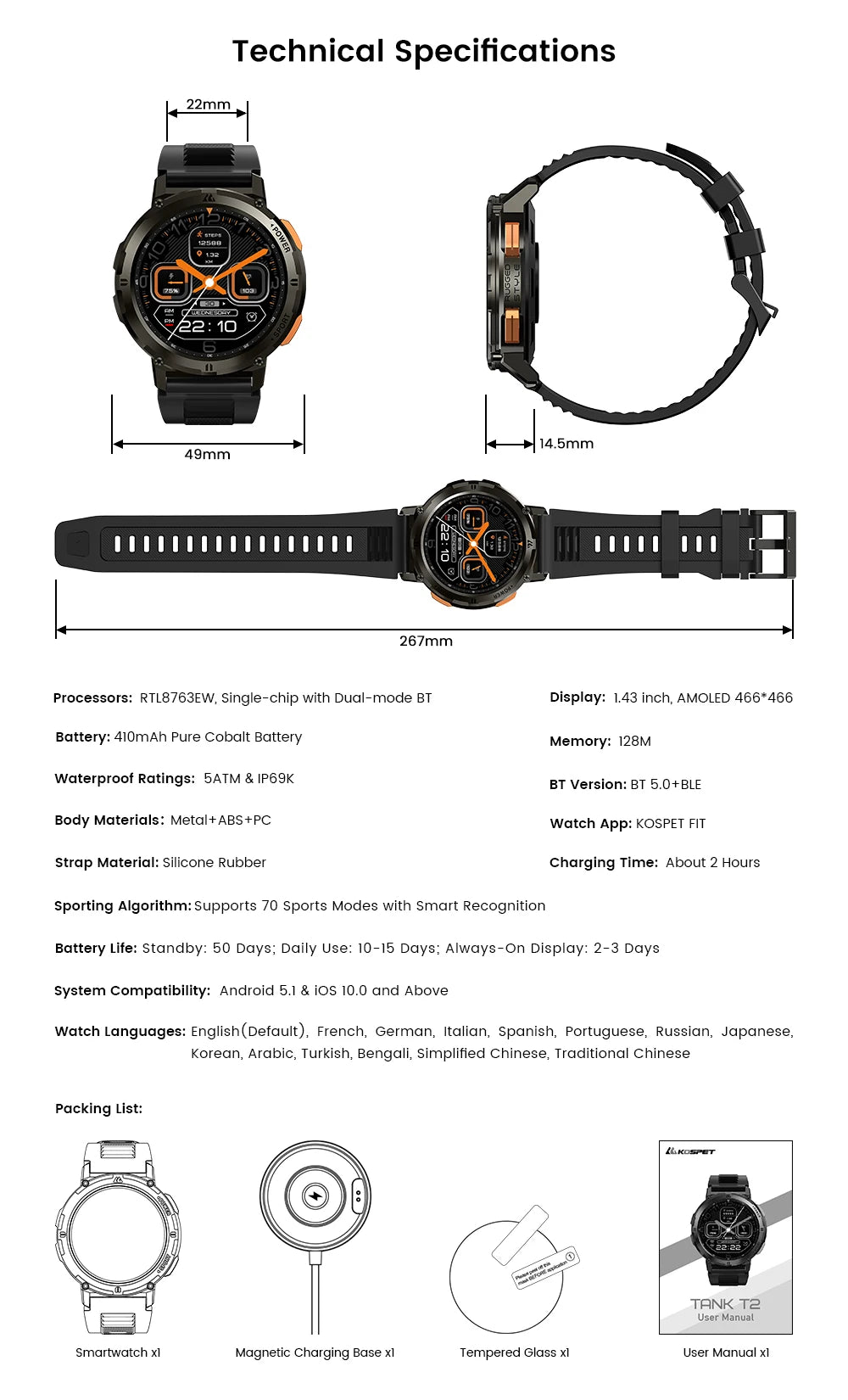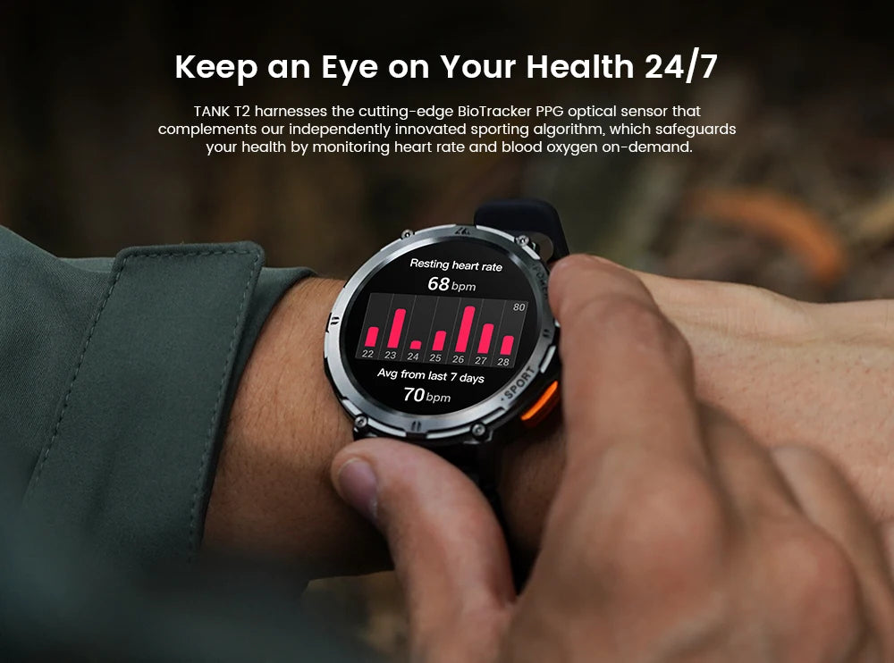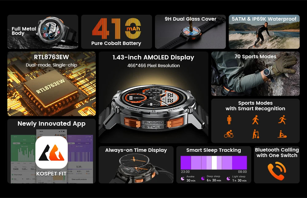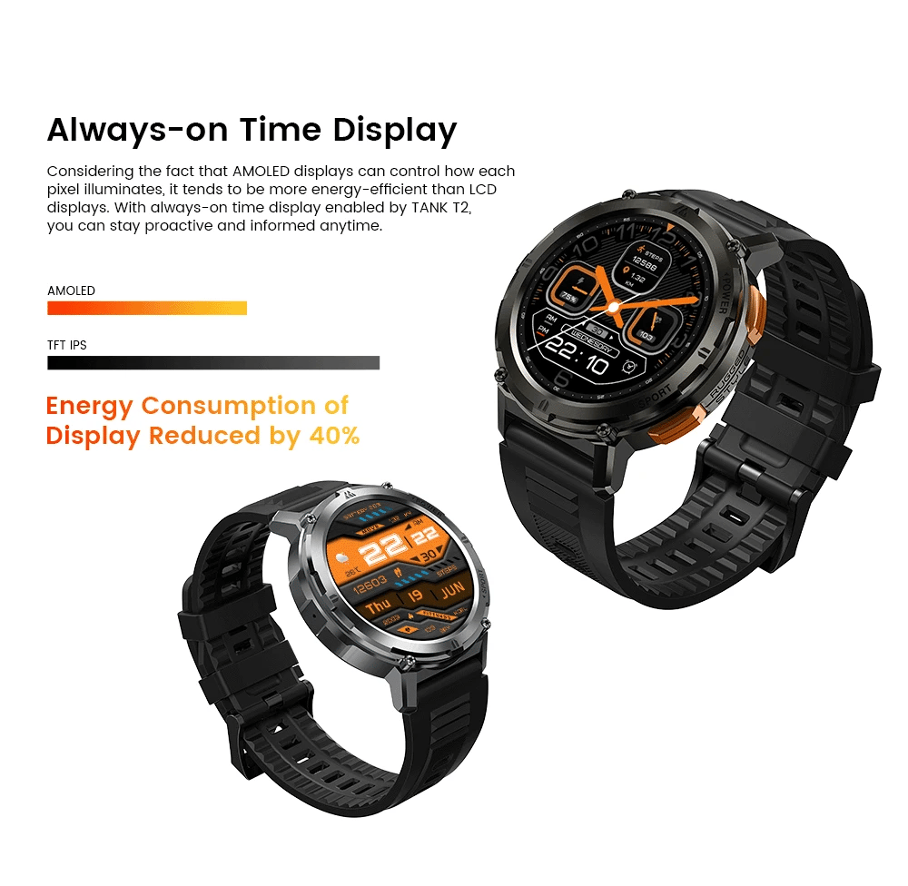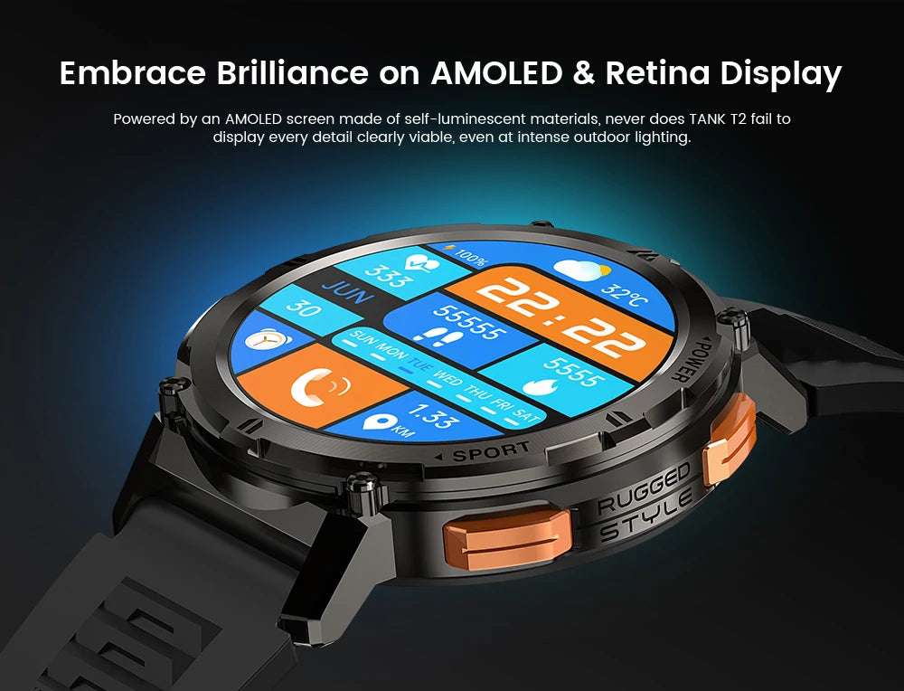 The KOSPET Tank T2 Ultra 1.43" AMOLED Smart Fitness Watch combines a high-resolution display, durable design, and advanced fitness tracking features, making it an excellent choice for individuals seeking a versatile and resilient fitness wearable.