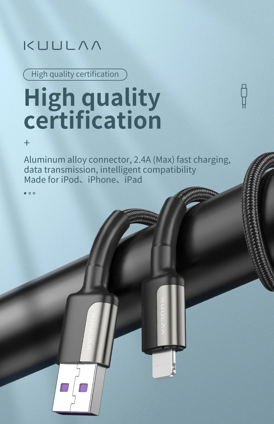 The KUULAA 2.4A USB to Lightning Charging and Data Cable is designed to enhance the connectivity experience for your Lightning-equipped devices. With its robust 2.4A charging capability, this cable provides fast and efficient power delivery, ensuring your iPhone, iPad, or iPod charges quickly and reliably. Whether you're at home, in the office, or on the go, you can depend on this cable to keep your devices powered up and ready to use.