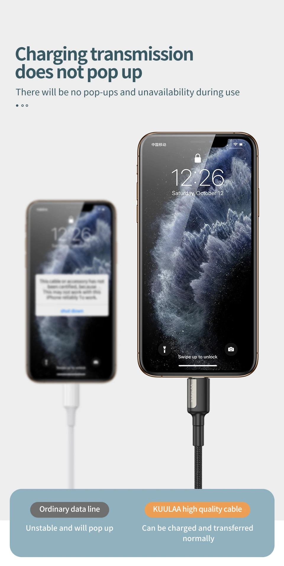 In addition to its impressive charging speed, the KUULAA cable offers high-speed data transfer, allowing you to sync your files, transfer photos, and manage data with ease. The cable's construction features high-quality materials that ensure durability and longevity, reducing wear and tear even with regular use.
