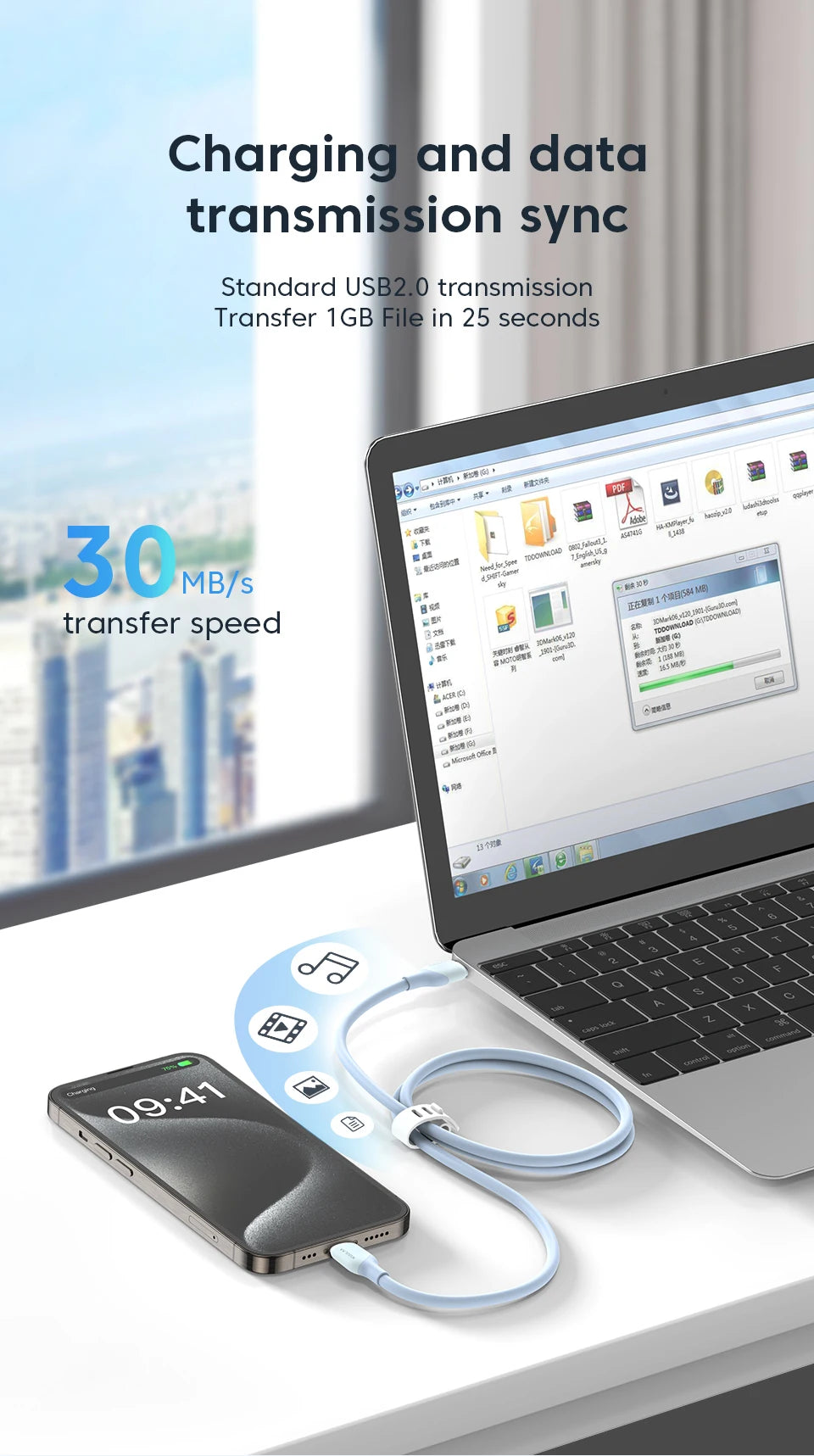In addition to fast charging, the cable facilitates high-speed data transfer, allowing for swift synchronization of files, photos, and other data. Its durable construction ensures long-lasting performance, while the flexible and tangle-free design enhances convenience and portability.