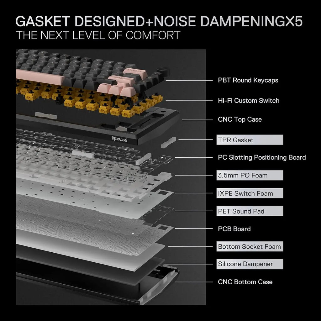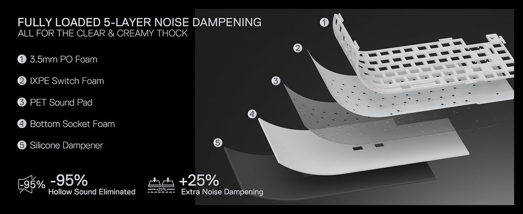- 5-Layer Noise Dampening – Equipped with multiple foam layers, PET sound pads, and silicone gaskets to minimise hollow noise, ensuring clean and dampened typing acoustics.