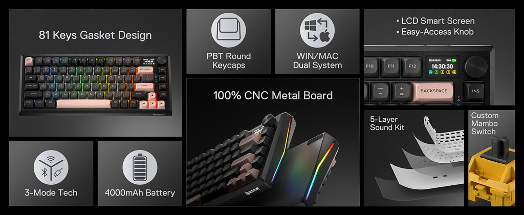 The REDRAGON Eclipse K720 Pro is a premium wireless gaming keyboard built for performance, comfort, and style. Featuring a smart TFT info screen, gasket-mounted design, CNC aluminium frame, noise-dampening layers, and custom hi-fi switches, this keyboard is engineered to elevate your gaming and typing experience. With tri-mode connectivity and software support for advanced customisation, the K720 Pro seamlessly blends practicality with cutting-edge design.