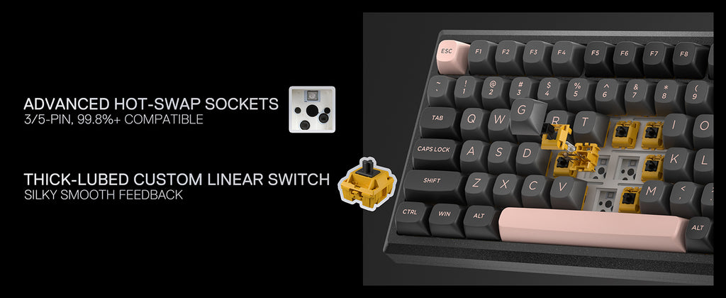 - Hi-Fi Custom Switches – Pre-lubed linear switches deliver smooth, fast, and elastic feedback. The upgraded hot-swappable socket supports most 3/5-pin switches, offering endless customisation.