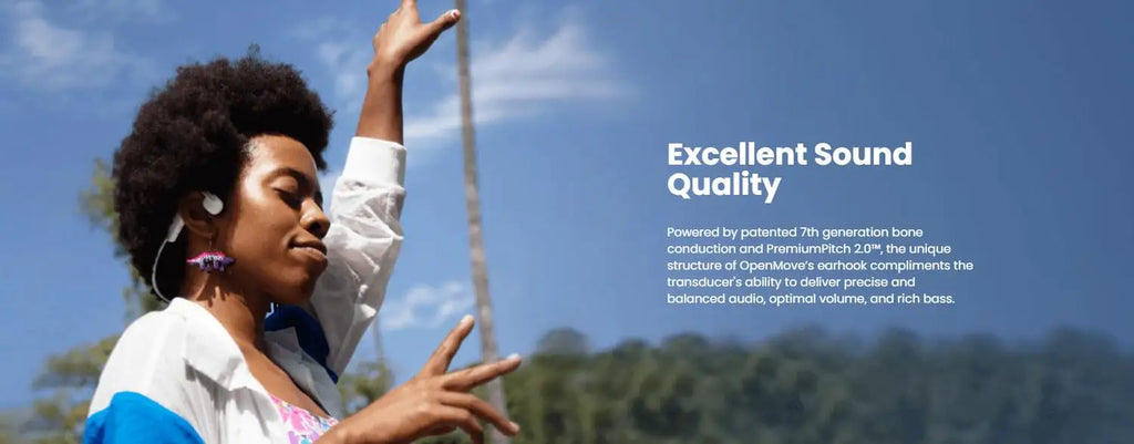 Unlike traditional earbuds, the OpenMove sits comfortably in front of your ears, leaving them free. This open-ear designkeeps you aware of traffic, surroundings, and people nearby, providing enhanced safety during workouts, commuting, or outdoor adventures.