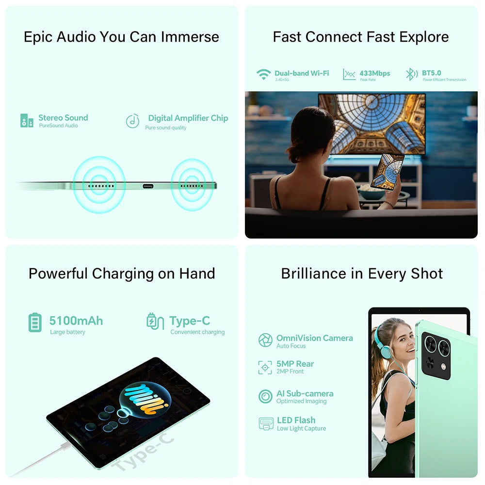 Crafted from premium metal and finished in an elegant Tea Green, this tablet is only 8.2mm thin, making it lightweight and easy to carry. Its refined design complements your style while providing durability for everyday use.