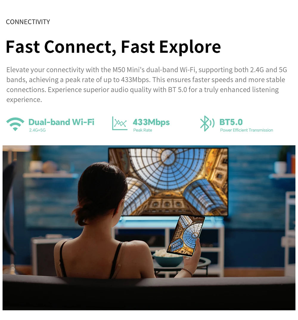 Powered by a 5100mAh battery with Type-C fast charging, the M50 Mini keeps you going throughout the day — perfect for streaming, gaming, and browsing on the go.