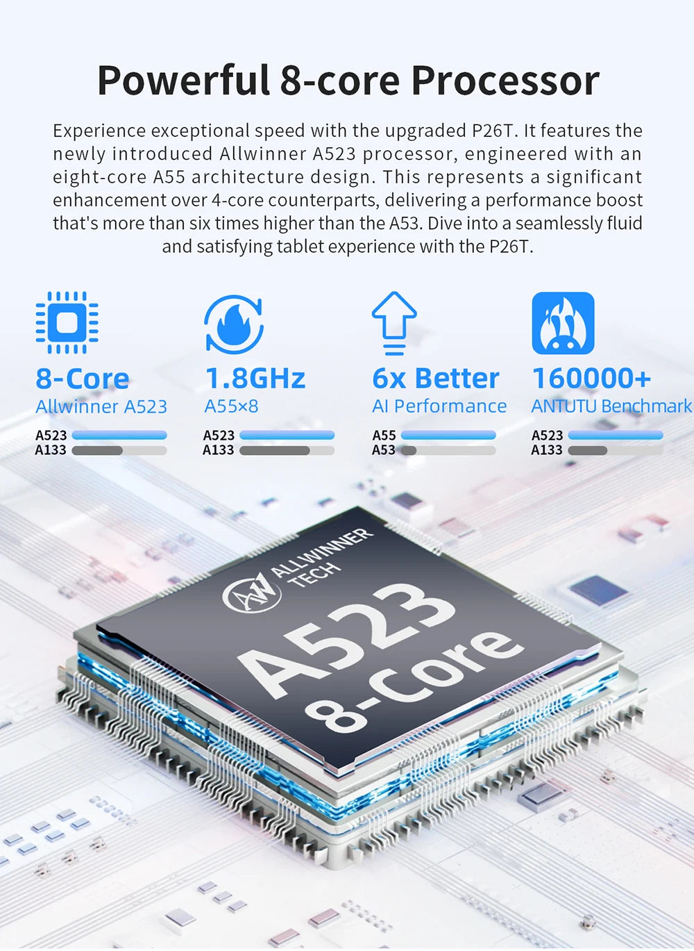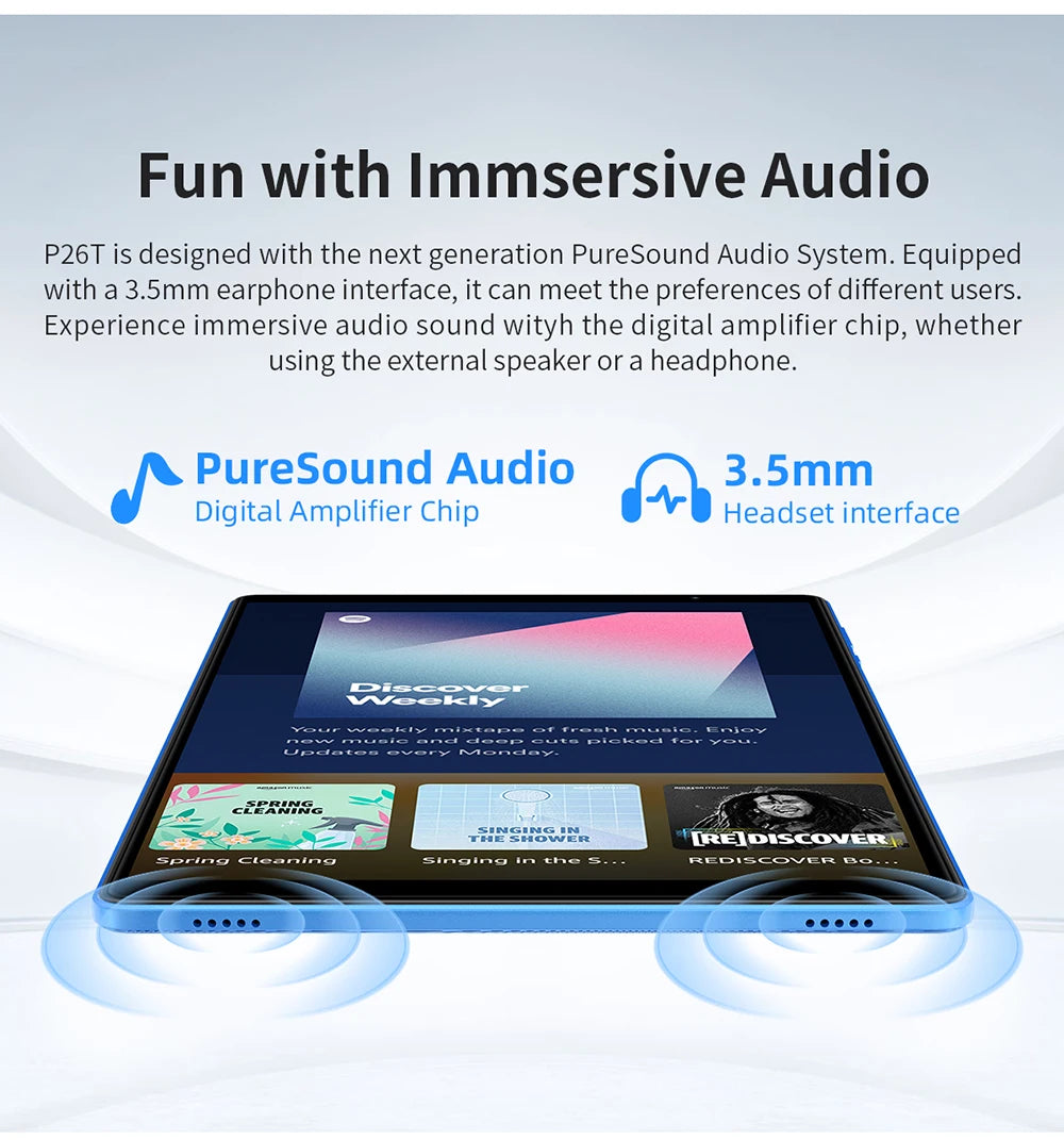 The TECLAST P26T combines sleek design, robust performance, and practical features for both work and play. Its vibrant 10.1-inch display, Android 13 OS, and octa-core processor deliver smooth operation and enhanced multitasking, while dual cameras and long-lasting battery support video calls, learning, and entertainment. With stylish blue wave-textured body, expandable storage, and wide connectivity options, the P26T is an ideal tablet for students, professionals, and casual users seeking a reliable and stylish Android tablet.