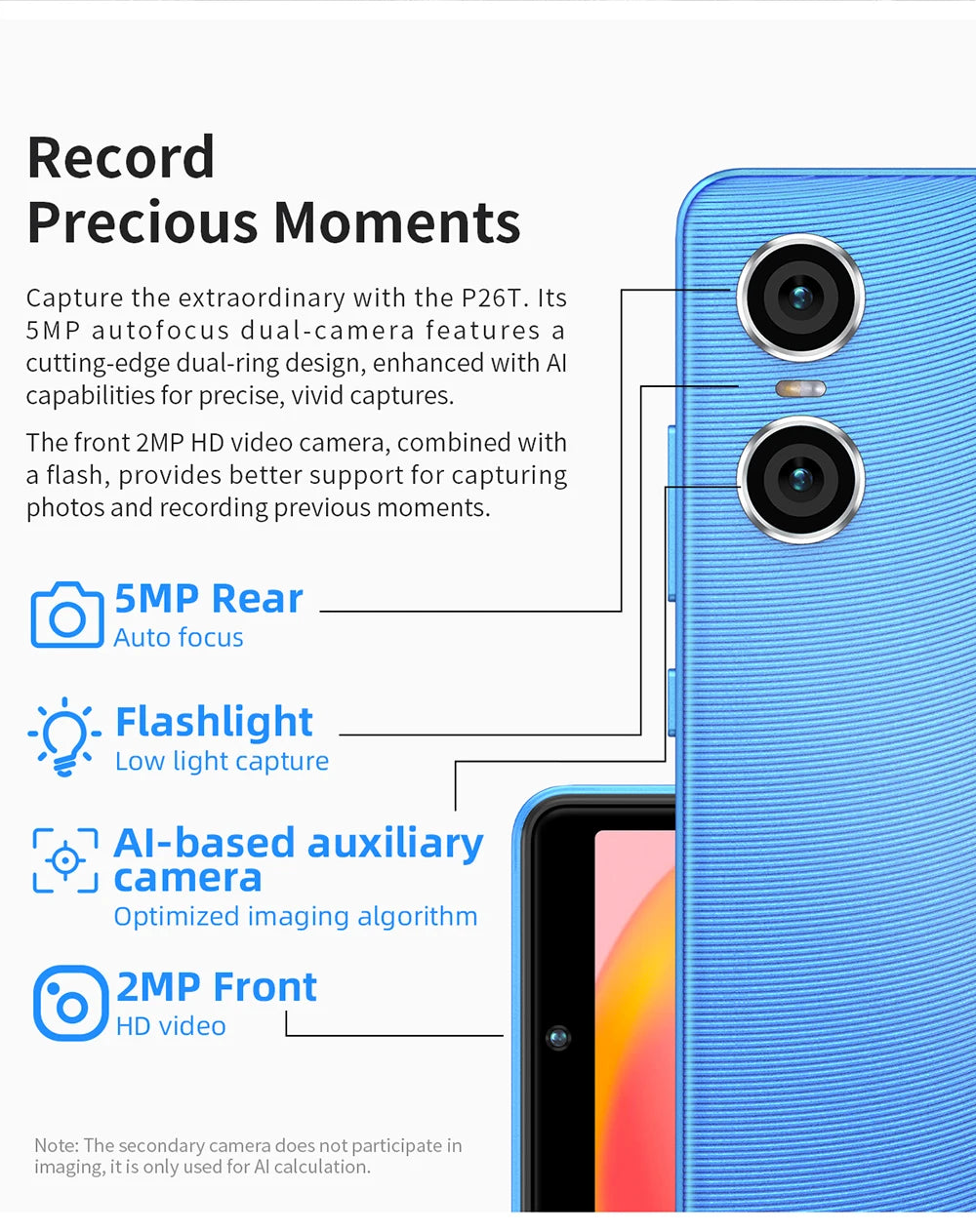 - Dual Cameras – Equipped with a 5MP rear camera and 2MP front camera, perfect for video calls, photography, and online learning.