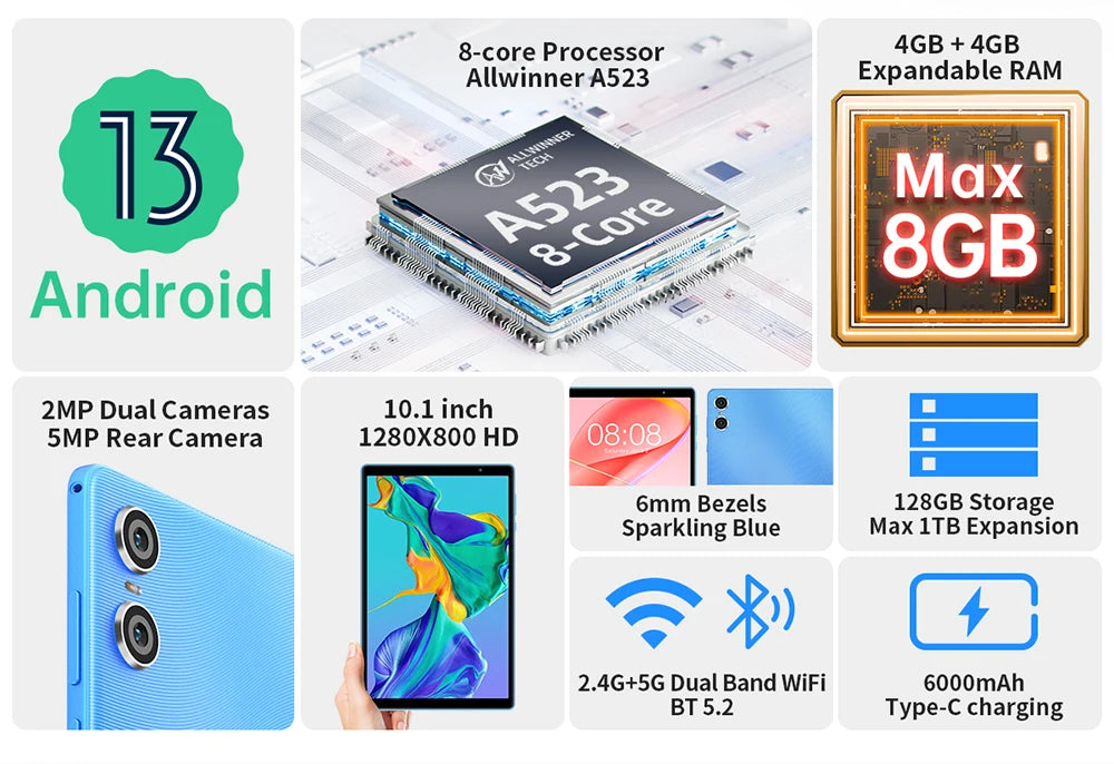 - Ultra-Thin Bezels & IPS Display – A 10.1-inch screen with 6mm ultra-thin bezels and 1280×800 resolution delivers wide viewing angles, sharp visuals, and a truly immersive multimedia experience.