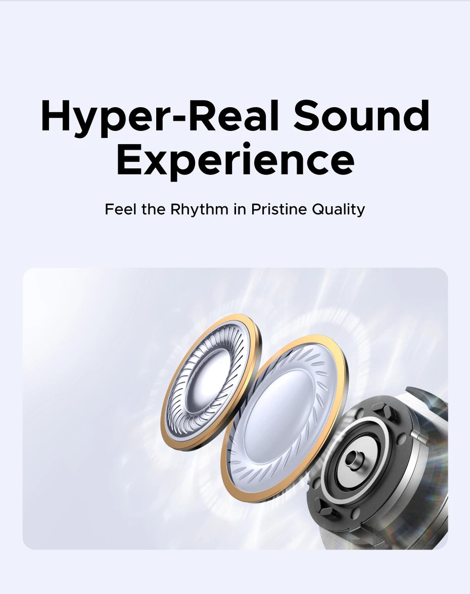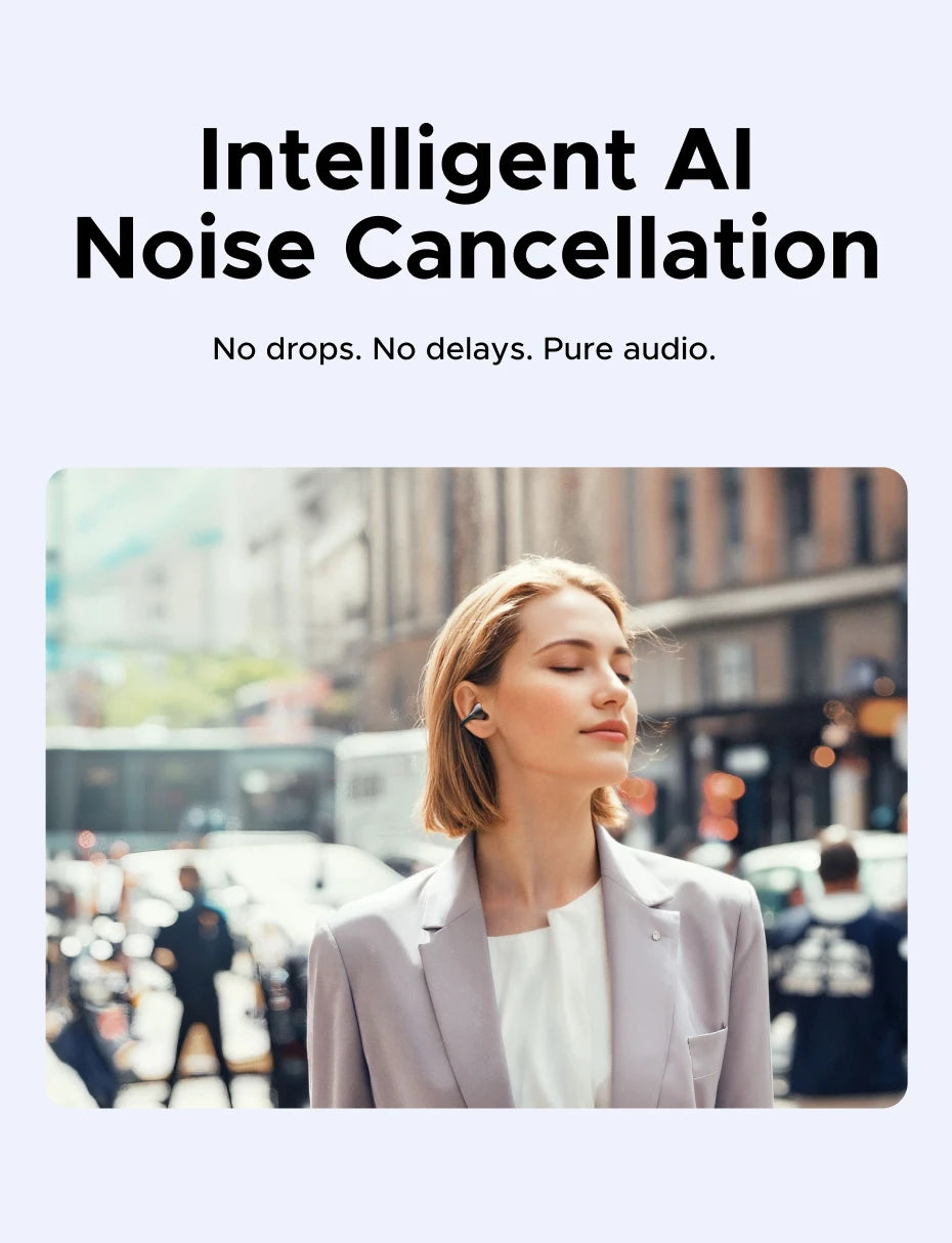 Each earbud contains four microphones supported by a smart AI noise-reduction matrix. This advanced system isolates your voice while suppressing environmental noise, ensuring your calls remain clear even in busy surroundings. Directional sound delivery also reduces sound leakage, offering greater voice privacy during conversations.