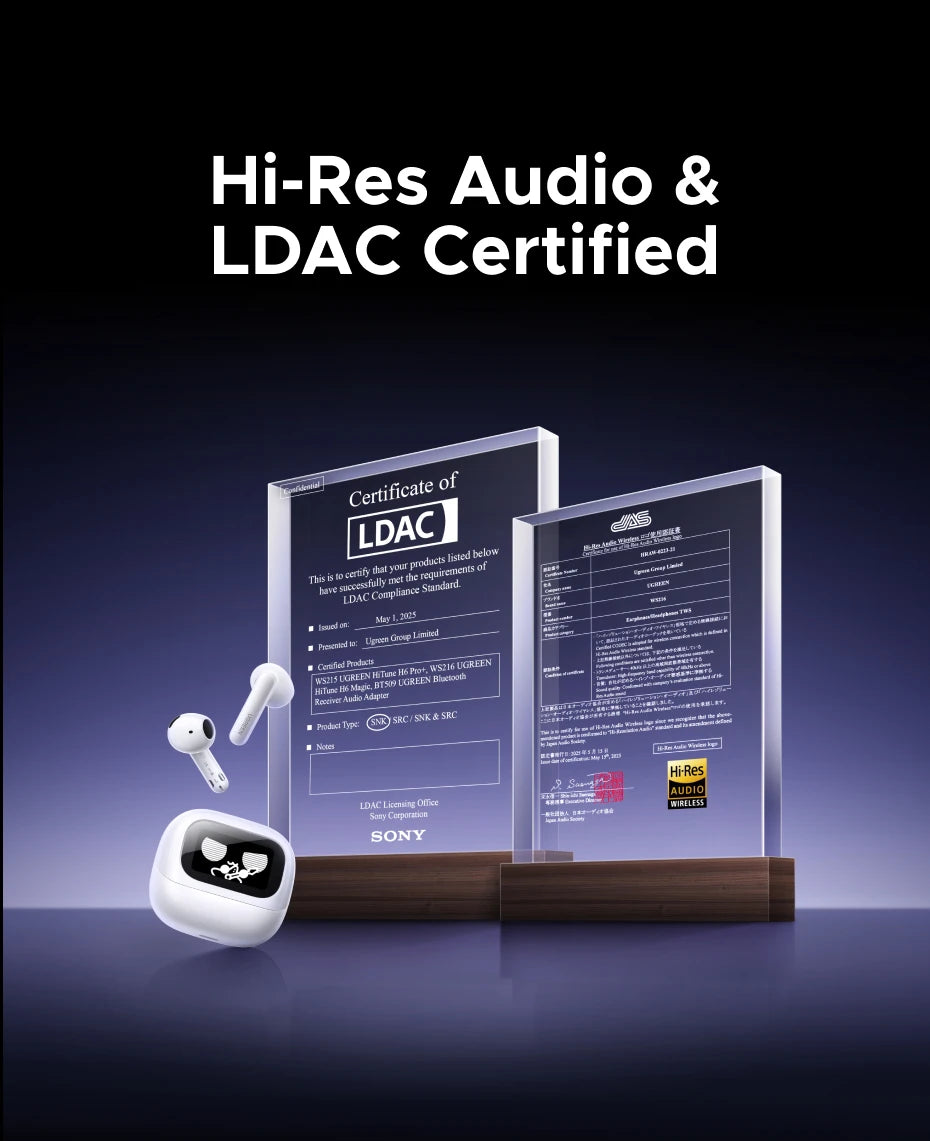 These earbuds deliver high-fidelity audio with Hi-Res Audio certification and support for AAC, SBC, and LDAC codecs. The 10 mm biological diaphragm produces balanced treble, vibrant mid-range, and powerful bass for a fully immersive audio experience.