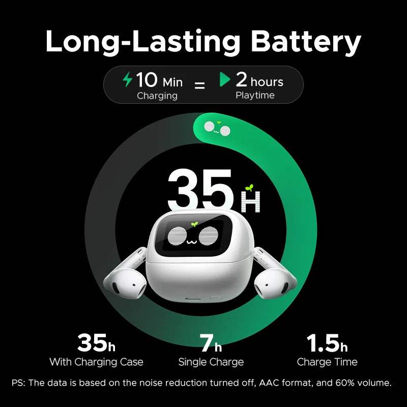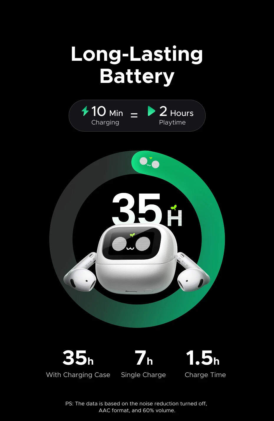 Enjoy around 6 hours of use on a single charge and up to 30 hours with the charging case. A quick 10-minute charge provides approximately 2 hours of listening, keeping you connected without interruption.