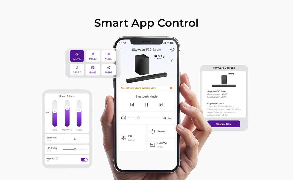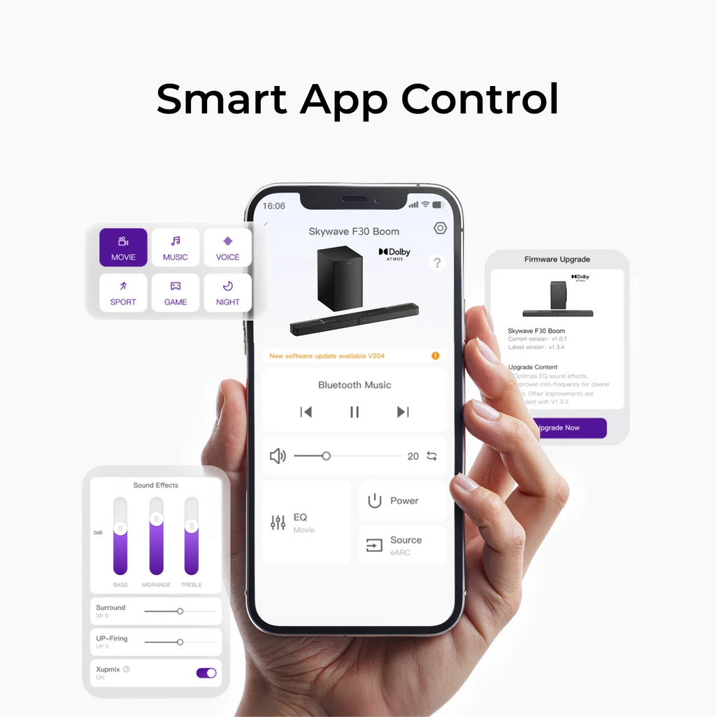 With Bluetooth 5.4 connectivity, app-based control, and future-ready OTA updates, the Skywave F30 isn’t just a soundbar—it’s a complete home cinema solution.