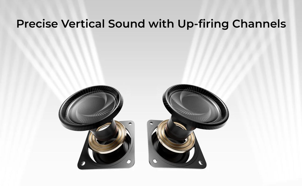 - Up-Firing Drivers with Neodymium Core – Aerospace-grade design with 18-core voice coils for accurate vertical sound throw and ultra-realistic height effects.